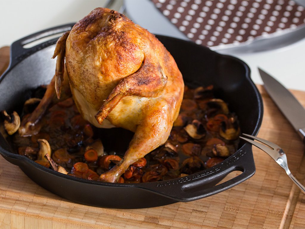Ak chcete robiť na grile kura s marinovaním z vnútra použite kvalitnú liatinovú panvicu so stojanom na kura: